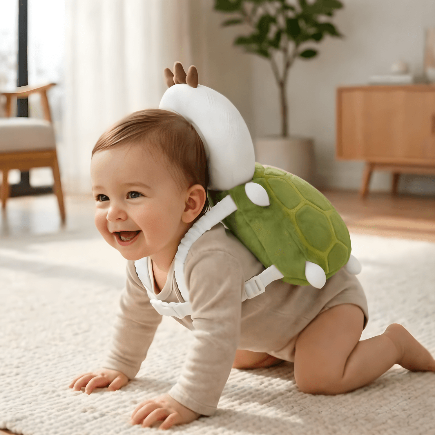 Przewiewny, przyjemny w dotyku materiał sprawia, że ochraniacz jest niemal niewyczuwalny podczas noszenia. Nie przeszkadza przy raczkowaniu, wstawaniu ani stawianiu pierwszych kroków.